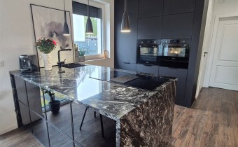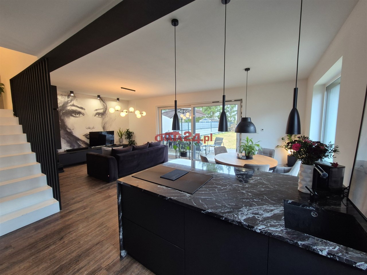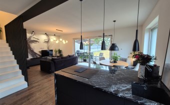 Strefa dzienna z nowoczesną kuchnią i wyjściem na taras.