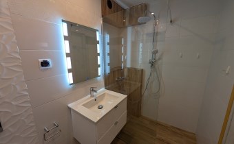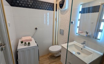Salon z wyjściem na balkon połączony z aneksem kuchennym otwarte na korytarz, tworzą klimatyczne, komfortowe wnętrze, którego dopełnieniem jest komfortowa łazienka.